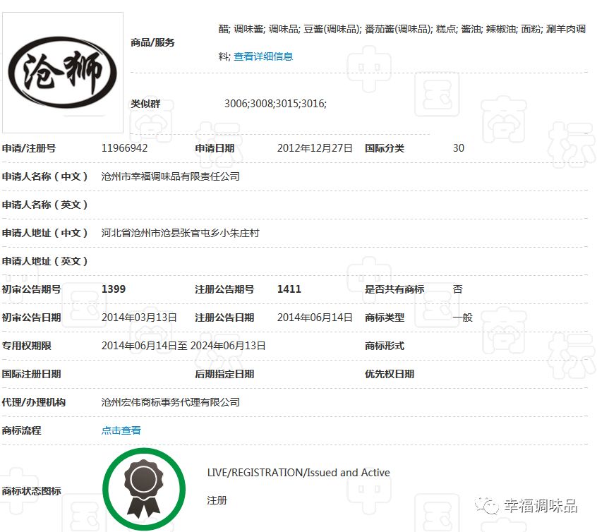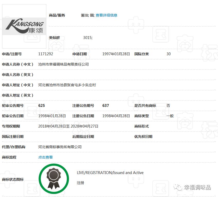 幸福調(diào)味品自創(chuàng)辦30多年以來,在工商部門指導(dǎo)下,充分認(rèn)識(shí)到商標(biāo)品牌的重要性,始終堅(jiān)持走創(chuàng)品牌的路子。公司的“康頌”商標(biāo)于1997年在30類,糖、茶、糕點(diǎn)、調(diào)味品類獲核準(zhǔn)注冊(cè)后,并根據(jù)市場(chǎng)需要,先后又注冊(cè)了包括“滄獅”中文及拼音在內(nèi)的等商標(biāo);形成了涵蓋多類別、多商品、多層次的商標(biāo)品牌庫。